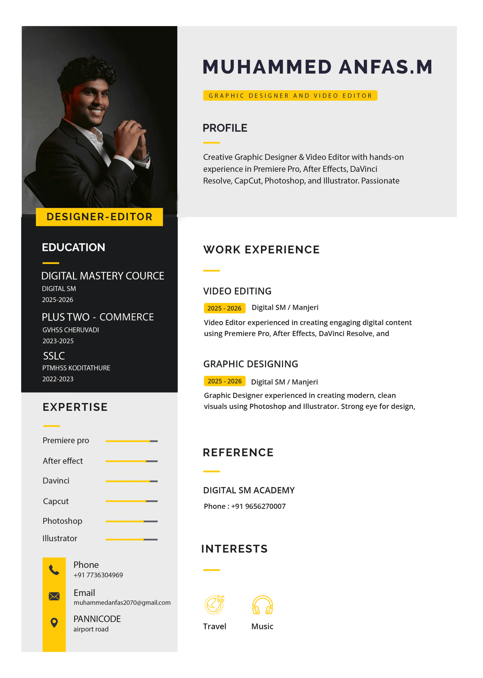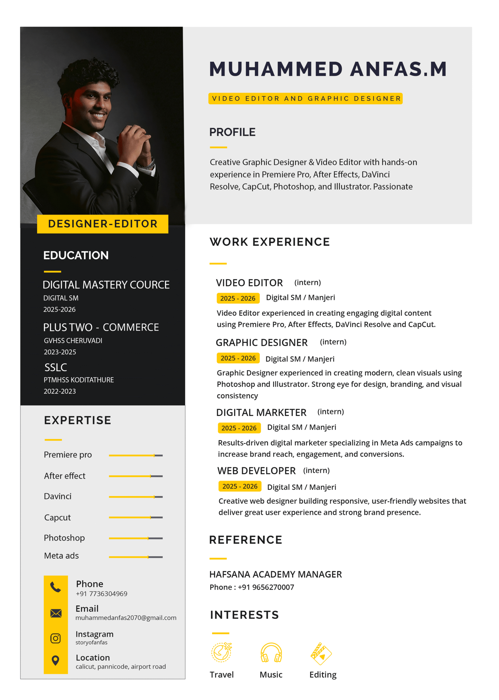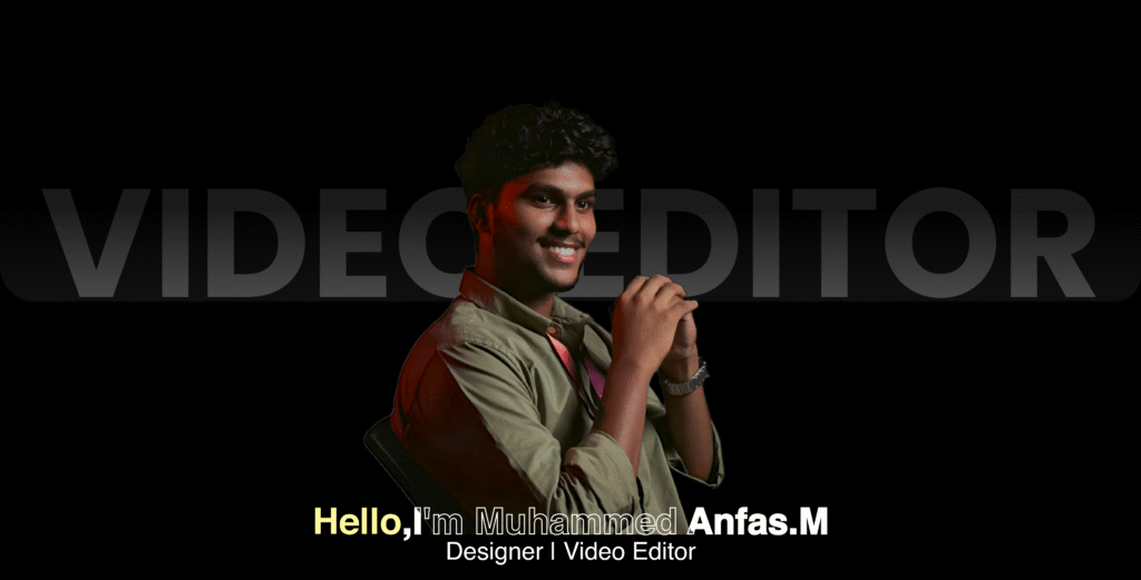 Hi! I’m Muhammed Anfas.M , a passionate Graphic Designer, Video Editor, Digital Marketer, and Web Designer Graphic Designer, Video Editor, Digital Marketer, and Web Designer with 1 year of professional experience. I specialize in creating visually compelling designs and impactful digital content that help brands stand out in today’s competitive world.
